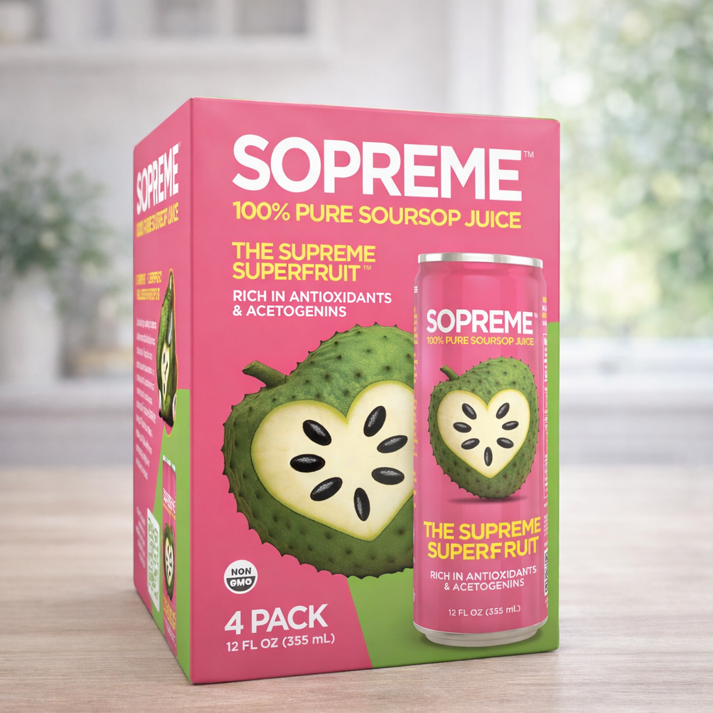 The SOPREME™ 4-Pack delivers 100% pure soursop juice in sleek, refreshing 12 oz skinny cans — crafted for those who value simplicity, quality, and real ingredients.