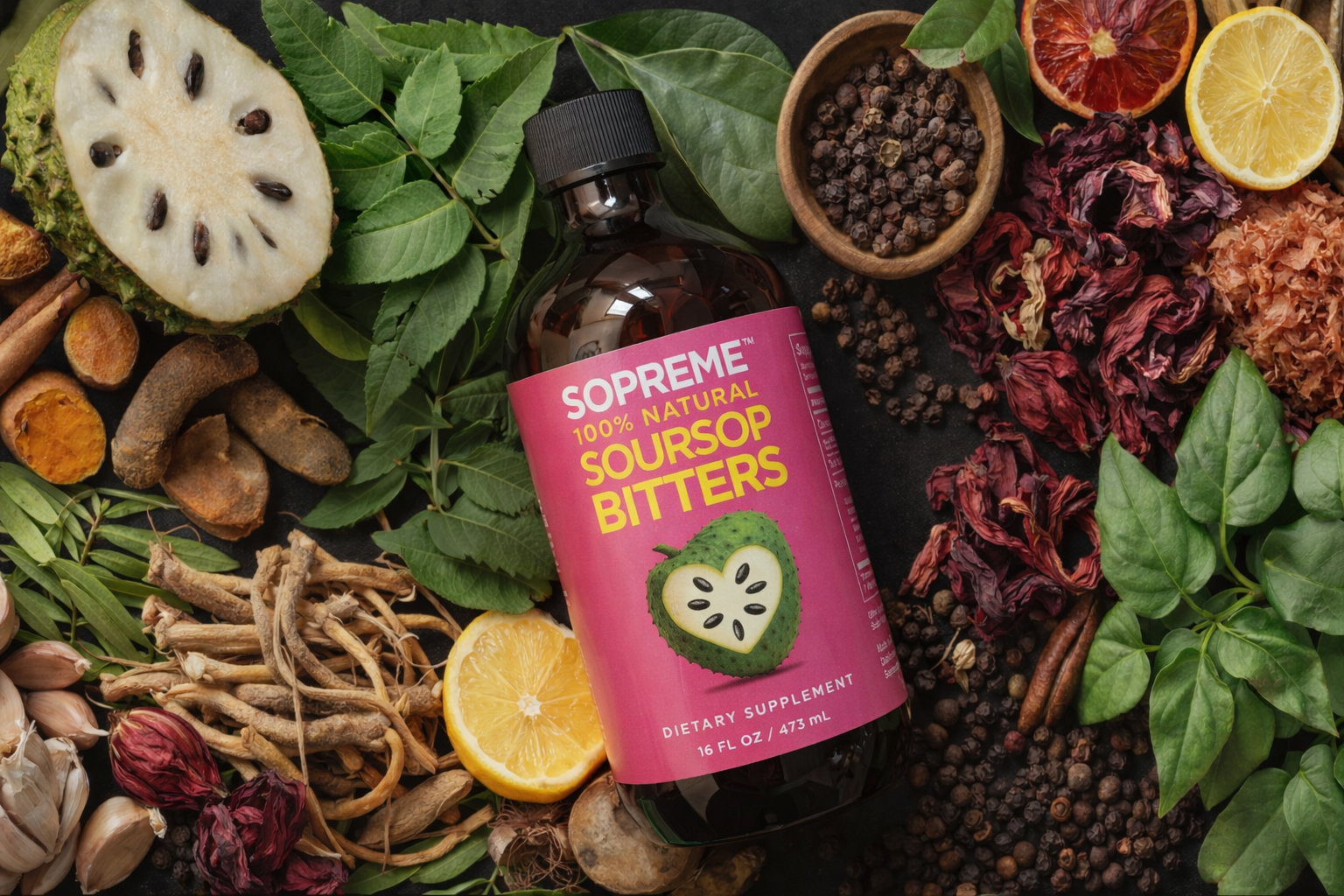 At the core of our bitters is a high-potency botanical extract system, anchored by soursop leaf extract (20:1) and complemented by globally respected herbs such as ginger, turmeric, hibiscus, neem, cinnamon, bay leaf, and ashwagandha. Each ingredient is selected not as a standalone trend, but as part of a synergistic formula—where every component plays a role in supporting digestion, balance, and overall vitality.